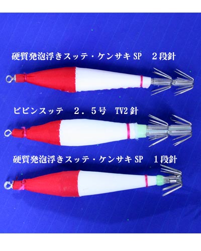 関東地方での小型のケンサキイカを「マルイカ」 若狭湾を中心とした、日本海エリアの小型のケンサキイカを「マイカ」 山陰沖の日本海エリアでのケンサキイカを「白イカ」 福岡、佐賀、長崎沖の玄界灘でのケンサキイカを「ヤリイカ」 鹿児島甑島沖、高知、和歌山沖でのケンサキイカを「アカイカ」と言う。 2.5号サイズを多用する関東エリア、関西エリア向けに開発したのが 「硬質発泡浮きスッテ・ケンサキSP」なのである。 通常の浮きスッテでは、実現が極めて困難だった、水中での水平姿勢を 可能にする為に、硬質発泡ウレタン素材を採用することで、 水平姿勢という抜群のバランスを実現することが出来た。 関東、関西のシビアなケンサキイカを攻略する為に生まれたスッテなのである。