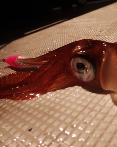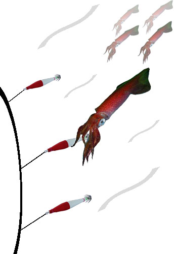 「周りの同船者よりも、数を釣りたい・・・」釣り人、誰もが思うこと。 数釣りで勝負をしたい時に、一番手っ取り早い方法は「連掛け」である。 1投で1ハイ釣るよりも、1投で2ハイ、3ハイ釣ったほうが効率よく数を伸ばせる。 気がつけば、同船者よりも2倍・・・3倍釣っていることに。 1匹掛かった状態で、誘いのシャクリを入れると、身切れ等で ばらしてしまう場合もある。では、どうすればいいのか。 1匹掛かった場合、超低速で巻き上げるか、ラインテンションを保ったまま、 糸を少し送り込んでやると、掛かっているイカが、イカの群れの中に仕掛けを、 引っ張っていき、更に連掛けできる場合がある。 その際に重要なのが「浮力と姿勢」。浮力のないスッテは針が下がった状態になり、 スッテの姿勢が悪く、誘いを入れないと動かない。浮力のあるスッテなら、 流れを受けてフワフワと漂い、更にイカを誘うことが出来る。 「連掛け」には「浮力と姿勢」が重要なのである。