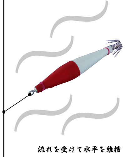 浮力のないスッテは、エダスを長く取るとスッテ自体が下がった状態になり、 幹糸に絡みやすくなってしまう。しかし、高浮力のケンサキSPは、 流れを受けたら水中で水平姿勢を維持しやすく、 長くハリスを取っても、絡みが少ない。もちろん、直ブラ仕掛けにも対応。 様々な誘い方にも使えるバランス設計で、ケンサキイカを誘い抱かせる。