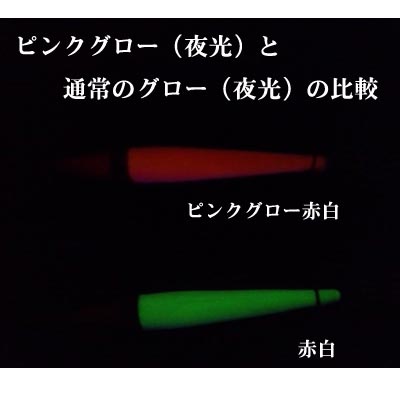 「硬質発泡浮きスッテ」「ケンサキSP」「ウキプラ」に採用している ピンクグロー発光。写真の通り、通常の夜光(グロー)とは まったく違った発光をする。では、どういう時に効果を発揮するのか。 仮に遊漁船で8名乗り合いの場合で、全員5本仕掛けだと、 船の真下に、40個のスッテがあることになる。 その40個のスッテの中に、まったく違った発光をする スッテが1個あったらどうだろうか。 一番目立つはずである。このカラーを発売して数年経ち、 よく釣れるカラーであり、実績を積み重ねてきているが、 まだまだ、未知の可能性を秘めているカラーであることは間違いない。