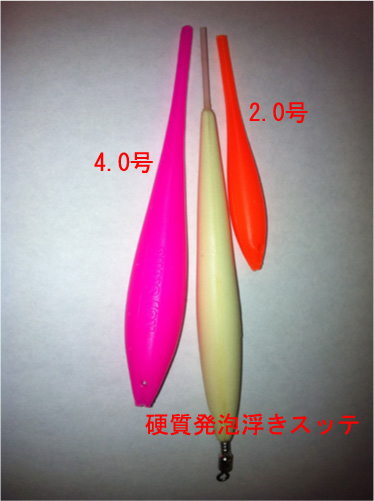 見ていただければわかるが、細さが違う。 硬質発泡浮きスッテは、前述しているように硬質発泡ウレタン製である。 ビビンスッテはプラスティック中空ボディー。 この細さが生み出すアクションで大型のヤリイカ、ケンサキイカを誘う。 その他、針の固定方法、発光方法もちがう。 似ているようで、まったく違う浮きスッテ。 シルエットの細さを活かし、一日中使っても同一のバランスを維持する為 硬質発泡浮きスッテは、綿(わた)を巻かずに布を巻いている。 浮力バランスが崩れる原因の一つは、綿と布が海水を吸ってしまうこと。 発泡浮きスッテは綿をなくし、吸水性の少ない撥水加工を施した布を採用している。 また、綿を巻いていない為、イカやフグに噛まれても布を破られにくい特徴を持つ。 では、ビビンスッテは釣れないのか?全くそうではない。 ビビンスッテは、ヤリイカやケンサキイカ釣りには欠かせない必須アイテムである。 シチュエーションによっては、硬質発泡スッテよりビビンスッテの方が釣れる場合もある。 状況による使い分けが必要であり、同じ仕掛けの中で両方を使うことをお薦めする。