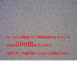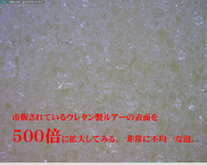 硬質発泡浮きスッテのボディ表面を、約500倍に拡大できる顕微鏡で観察してみると非常に興味深い。 ここには、非常に均一な気泡が規則正しく並んでいることが確認でき、硬質発泡浮きスッテが非常に高バランスである理由がわかる。 これは、キーストンが長年培ってきた特殊な成型技術であり、純国産(日本製)の技術である。