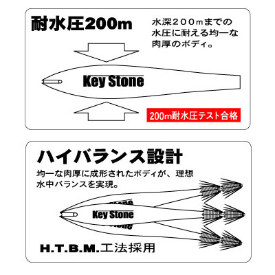 船からの『ヤリイカ』、『ケンサキイカ』 『スルメイカ』狙いに必需品の 『浮きスッテ(ウキスッテ)』。 伝統的なブロー成型で、バラつきの少ない浮きスッテの製造は 極めて難しい技術である。肉厚に偏りがあると、水圧で潰れ使い物にならなくる。 キーストンでは創業以来、国内生産とブロー成型にこだわり 日本全国のイカ釣りに対応すべく、 水深200mまで対応可能な肉厚ボディーに設計。 様々なご要望にお答えできるよう下地の色、 布の種類、布の色、多数ご用意。 基本性能を忠実に守り、1本1本丁寧な最高の仕上げ。 佐賀県有田町にある工場にて、 デザイン設計~金型成型~製品成型まで一貫生産し、 高品質のこだわりのスッテを作り続けている。