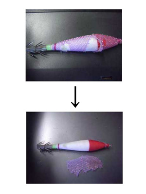 ビビンスッテの様々なカラーの中で、人気のメタリック布を巻きつけたカラー。 しかし、フグやイカの歯でやぶれてしまう事がある。 やぶられた場合、見た目が悪いから釣れなさそう、と思う方も多いと思う。 そんな時は、メタリック布をはさみで切ってはずしてしまおう! メタリック布をはずすと、下地のノーマル布が現れ、 ノーマル布の状態で再度使用が可能に。 やぶられた場合は、ぜひお試しを。 ※布をとめている、縫い糸を切らないよう慎重に行なってください。