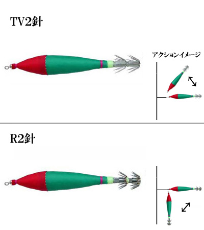 ・TV2針(標準) TV2は、通称「テグス巻き」や「手巻き」と言われており、 テグス(糸)でイカ針を固定することにより、浮きスッテを軽量化させている。 TV2は、浮きスッテのバランスをベストに維持するための、 伝統的な規格であり多くの漁師がこの規格の浮きスッテを使用している。 特に、ヤリイカ、ケンサキイカを狙う漁師が、樽流し漁を行うときは、 浮きスッテのバランスに非常に気を使うため、多くはTV2搭載の浮きスッテを採用。 TV2を搭載したビビンスッテの浮力バランスは、様々なエダスの長さに対応しており 一般的な船釣りによるヤリイカ、ケンサキイカ狙いにも多く利用されている。 ・R2針(ご注文時オーダーにて別注作製) ご注文時に、ご指定を頂ければR2針でも作成可能。 TV2針に比べ、針が若干重くなる為、海中では針が水平より少し下がった状態になるが、 逆にその重さを利用することで、上下のフリがダイナミックになる。 R2規格の針は、TV2規格のものより強固であるため、 直結仕掛け等、耐久力が必要な場合にオススメである。 エダスを出したブランコ仕掛けの場合は、1~5cm使用がオススメ。